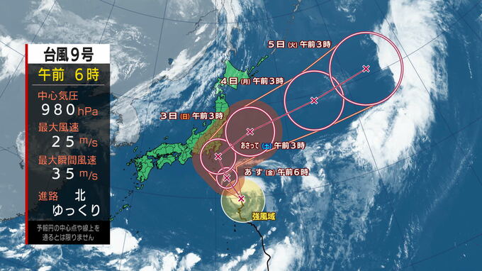台風9号は31日(木)午前6時現在、父島の北北東およそ320キロにあって、ゆっくりと北へ進んでいます。中心気圧は980ヘクトパスカル、中心付近の最大風速は25メートルです。