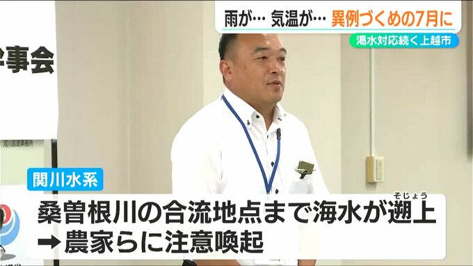 渇水の上越市では温泉の無料入浴サービス 新潟県内の7月の降水量は各地で史上最少に 新潟放送 2025年8月1日(金) 03:28 国内 31日には市内を流れる関川と姫川の管理者や発電事業者らが集まって情報を共有する連絡会議が開かれました。 高田河川国道事務所によりますと、関川水系の桑曽根川の合流地点まで海水の遡上が確認されたということで、農家らに注意喚起を行っています。