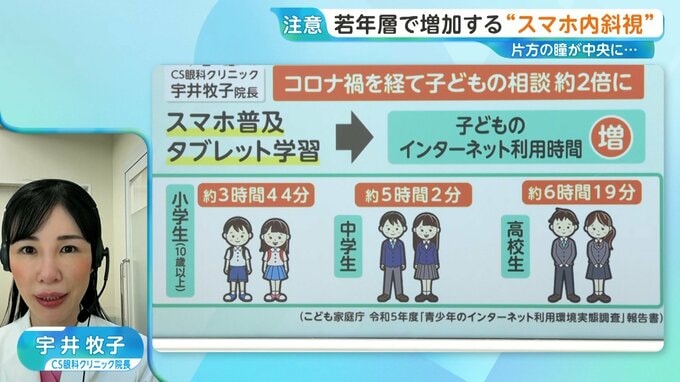 原因として考えられるのはスマホの普及やタブレット学習で、子どものインターネットの利用時間が増えていることです。