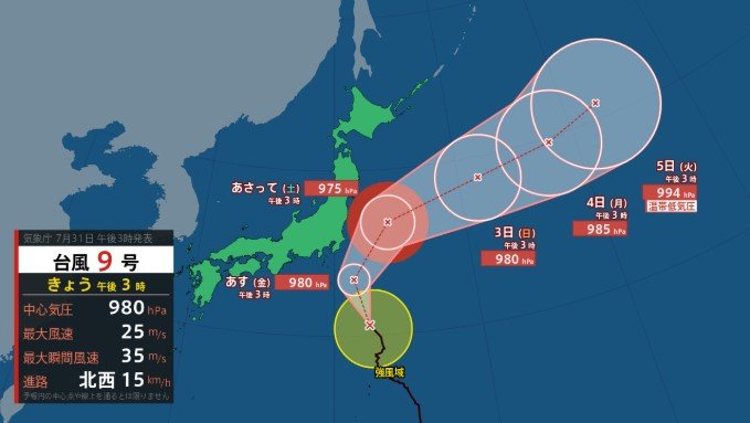 気象庁によりますと、台風9号は、31日午後3時には日本の東にあって、1時間におよそ15キロの速さで北西へ進んでいます。中心の気圧は980ヘクトパスカル、中心付近の最大風速は25メートル、最大瞬間風速は35メートルで、中心の南東側280キロ以内と北西側220キロ以内では風速15メートル以上の強い風が吹いています。