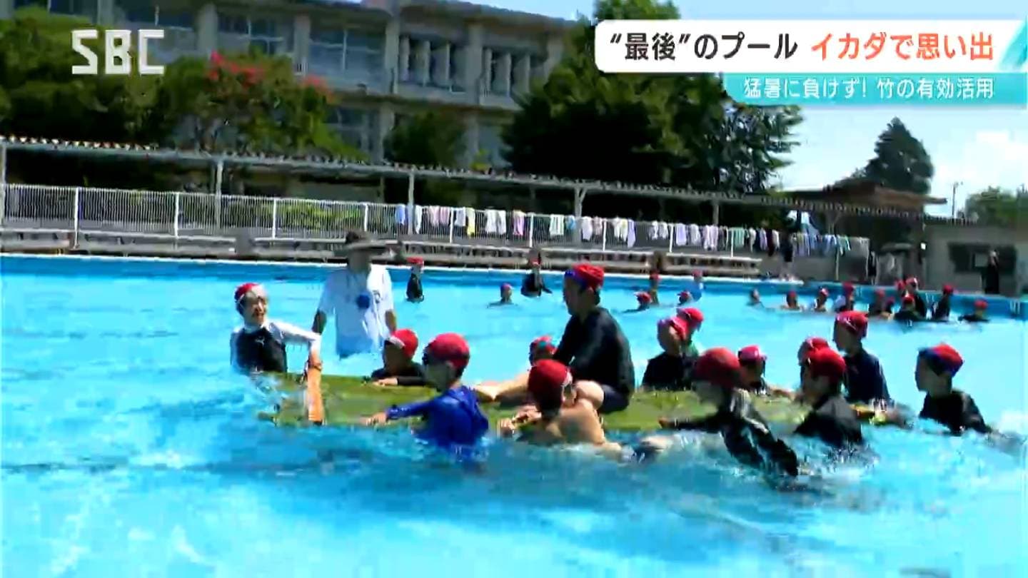 連日、35度以上の猛暑日となっている飯田市。竜丘(たつおか)小学校のプールでは、6年生40人余りがイカダづくりにチャレンジしました。