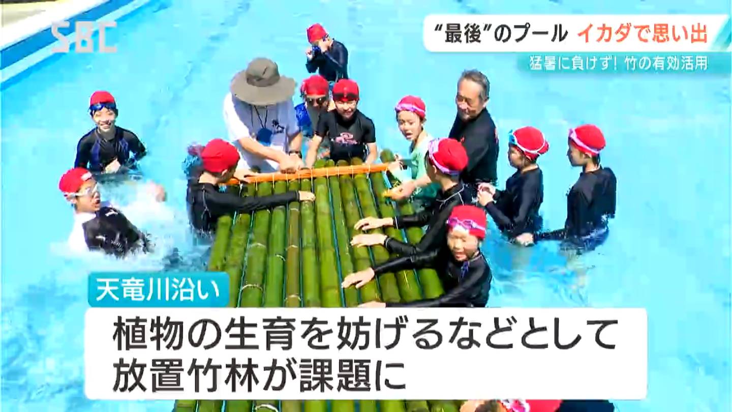 飯田市の小学6年生が、学校のプールで竹を使ったイカダづくりを体験しました。