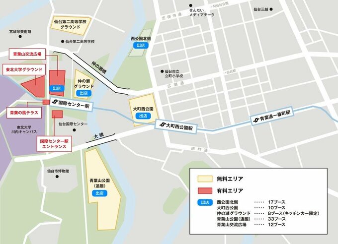 有料観覧席は4500円からで、東北大学のグラウンド、地下鉄東西線の国際センター駅エントランス、青葉山交流広場、青葉の風テラスの4エリアに5つ設けられます。
