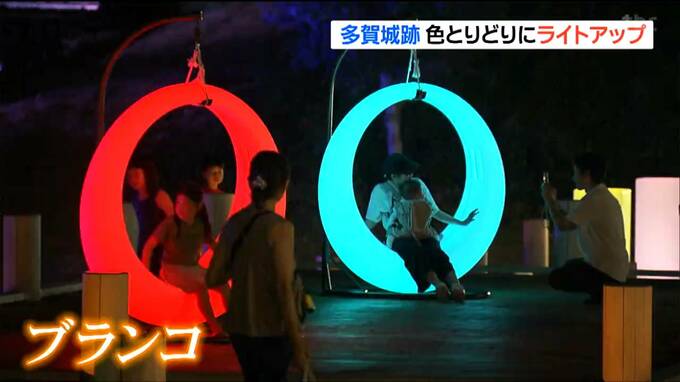 暗闇の中、明るく光る輪も登場。その正体はブランコです。かつてあった役所の土台や柱の跡が復元されたこのエリアにあるブランコでは、若者や家族連れなど多くの人が揺られながら写真を撮るなどして思い思いに楽しんでいました。