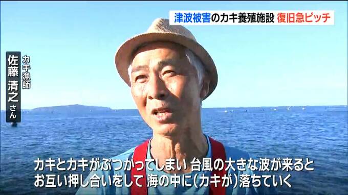 「いまは津波で(海底の)いかりが動いていかだが縮まったような状態。カキとカキがぶつかってしまい、台風の大きな波が来るとお互い押し合いをして海の中に(カキが)落ちていく」