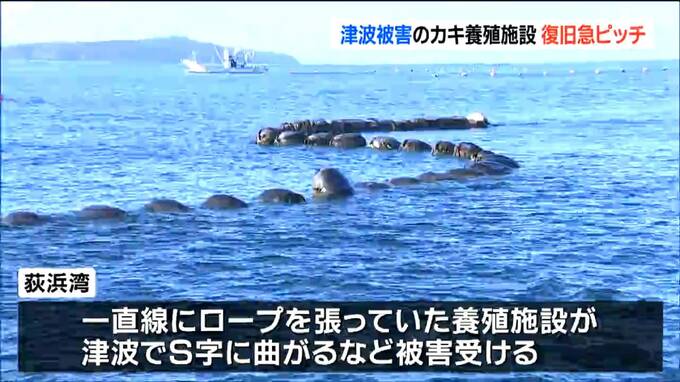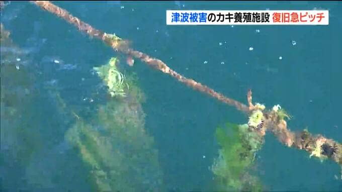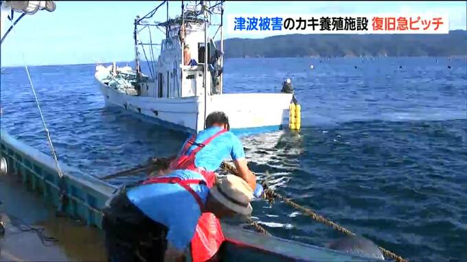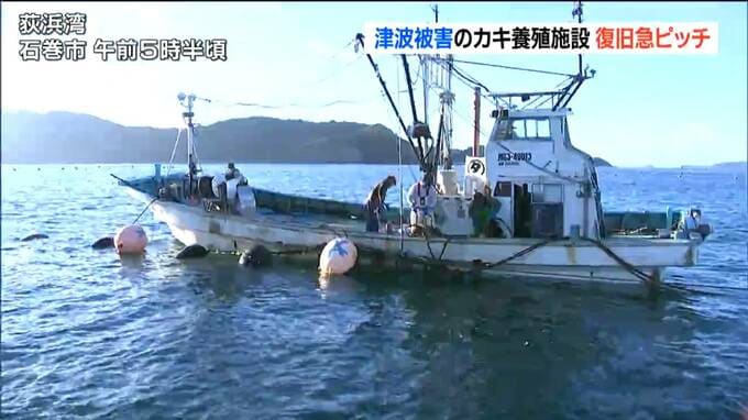 宮城県石巻市の荻浜湾では、1日朝、津波被害を受けたカキ養殖施設の復旧が行われ、地元の漁師たちが、たるんでしまったロープを元に戻すなどしました。