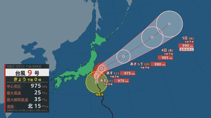 台風9号は1日正午現在、八丈島の東およそ170キロにあって、時速15キロで北へ進んでいます。中心気圧は975ヘクトパスカル、中心付近の最大風速は25メートルです。
