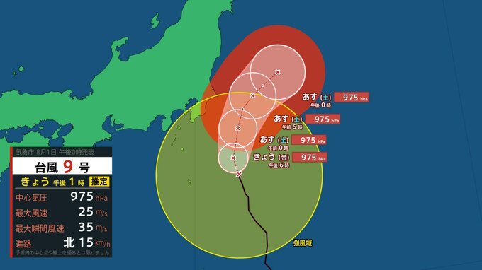 予報円の中心…北緯41度25分(41.4度) 東経161度00分(161.0度)