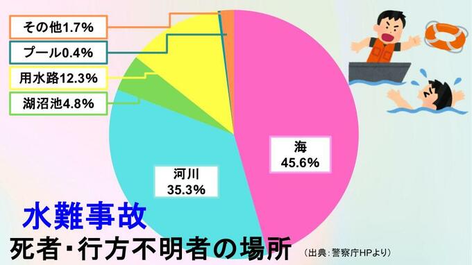 警察庁のデータによると、水難事故の発生件数は例年7月・8月に集中しています。昨年(2024年)はなんと1535件もの事故が発生し、水難者は1735人、うち死者・行方不明者は816人にも上ります。そして最も事故が多い場所は海で45.6%、次いで河川が35.3%と自然の水辺での事故が多いことがわかります。