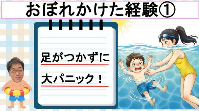 1度目は小学校低学年の時、学校のプールで足のつく場所から深いところに進んでしまい、生まれて初めて足がつかない場所でパニックに。その時助けてくれた6年生のお姉さんのことは今でも忘れられません。