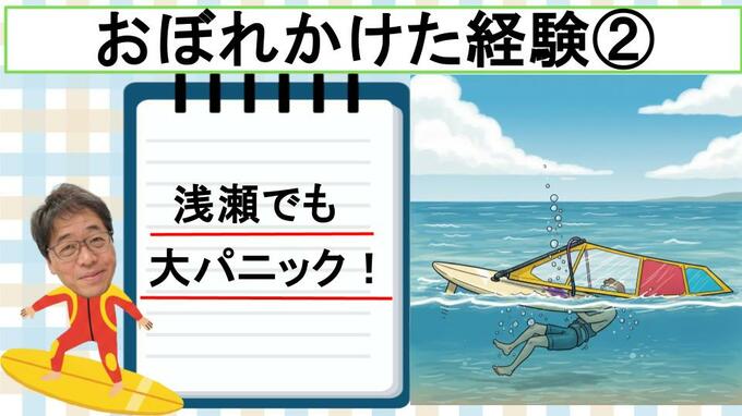 2度目はウインドサーフィン中に転倒し、自分の上に帆が被さってしまった時です。膝くらいの深さの場所だったにも関わらず、おぼれそうになり、水平方向に移動してなんとか難を逃れました。この経験から浅くても危ないんだなと痛感しました。