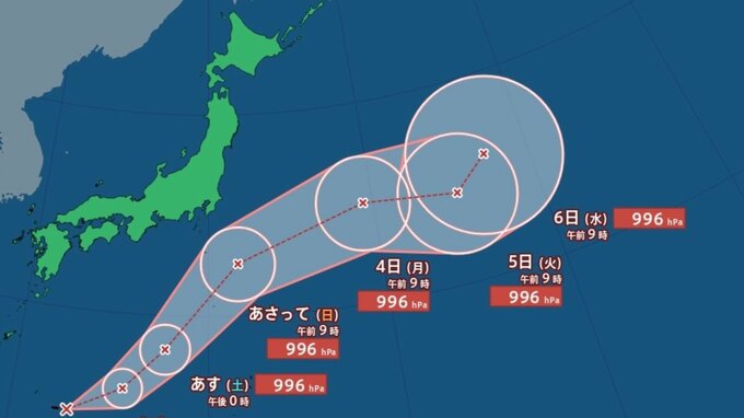 予報円の中心…北緯35度55分(35.9度) 東経157度20分(157.3度)