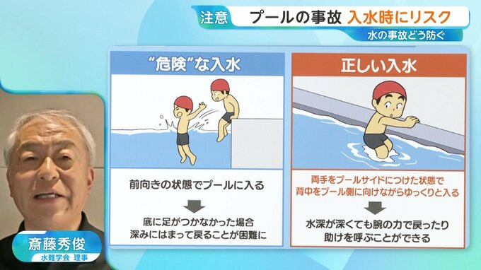斎藤氏は、「入水直後に事故が起こるケースが多く、児童に正しい入水方法を教え、実践することが重要」と話します。