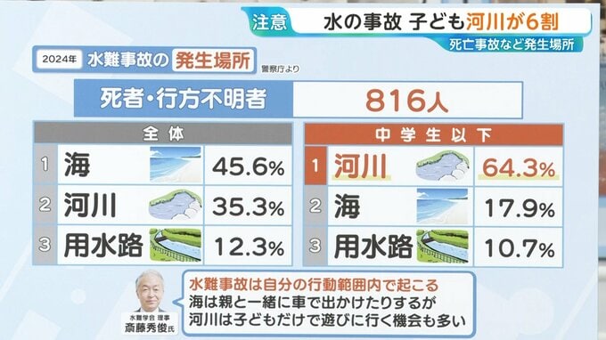 発生場所を見ると、全体では▼海(45.6%)▼河川(35.3%)▼用水路(12.3%)と海が一番多くなっていますが、中学生以下では▼河川(64.3%)▼海(17.9%)▼10.7%と河川での事故が多いことが分かります。