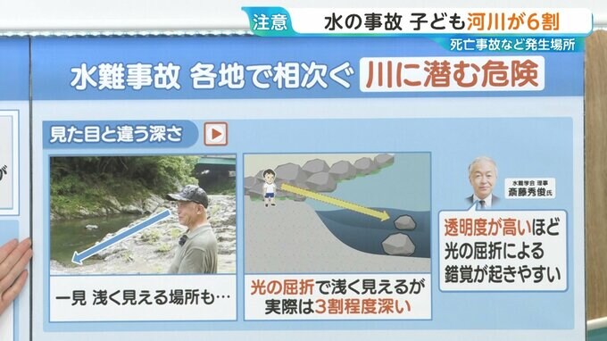 川岸から川を見たときに一見浅く見える場所も、実は光の屈折で浅く見えており、実際は3割ほど深くなっています。