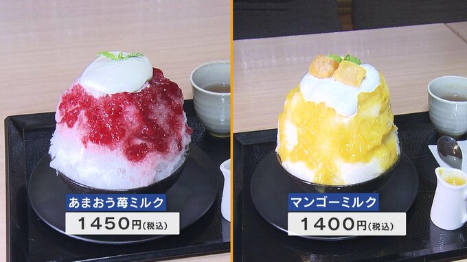 かき氷は5種類でパティシエ経験者がレシピを考案。「ショコラミルク」や「きな粉キャラメル」など、洋菓子のような味もある中で、2大人気は「あまおう苺ミルク」と「マンゴーミルク」です。