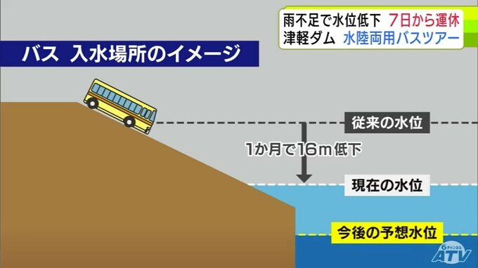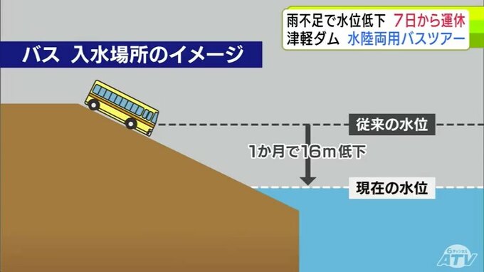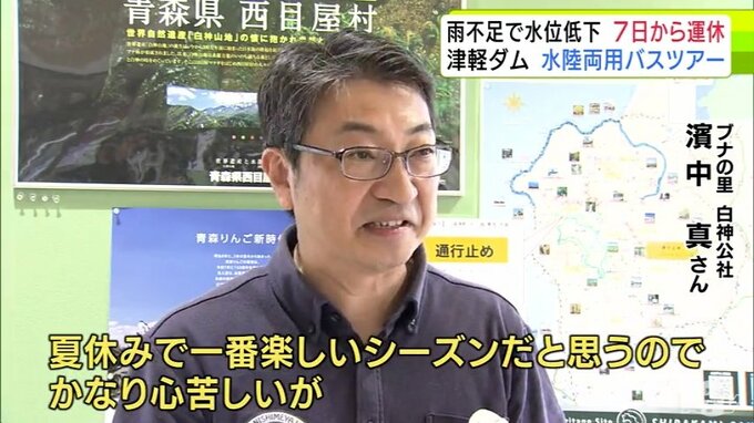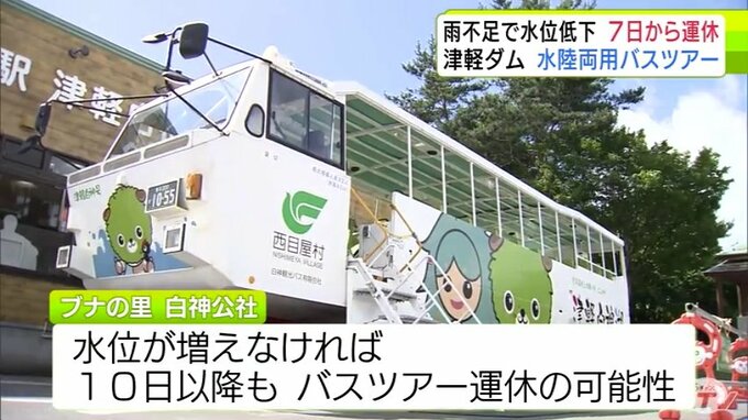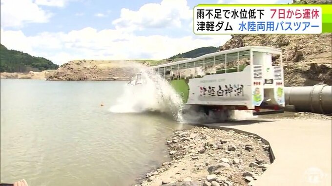 雨の少ない日が続いたことで、夏の観光に影響が出ています。青森県西目屋村の「津軽ダム」で運行する『水陸両用バス』のツアーが8月7日から3日間、運休することになりました。雨が降らなければ、運休期間は延長する可能性があります。