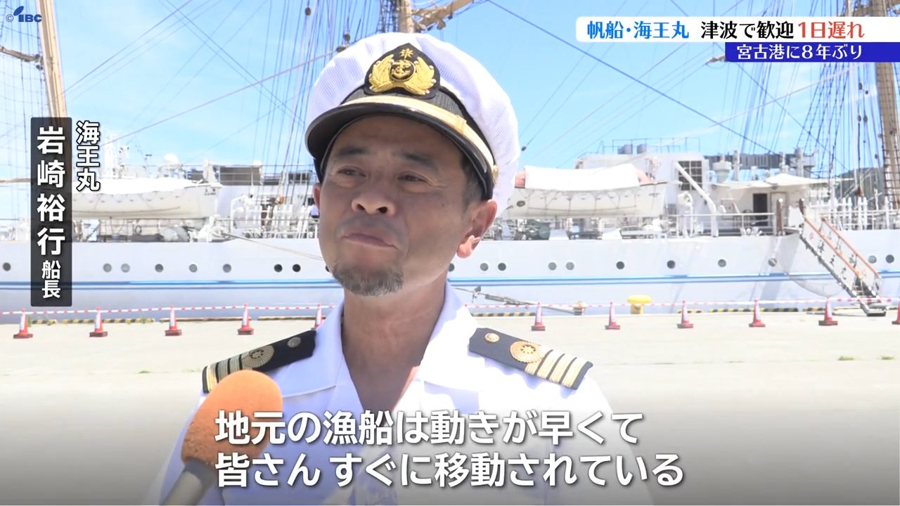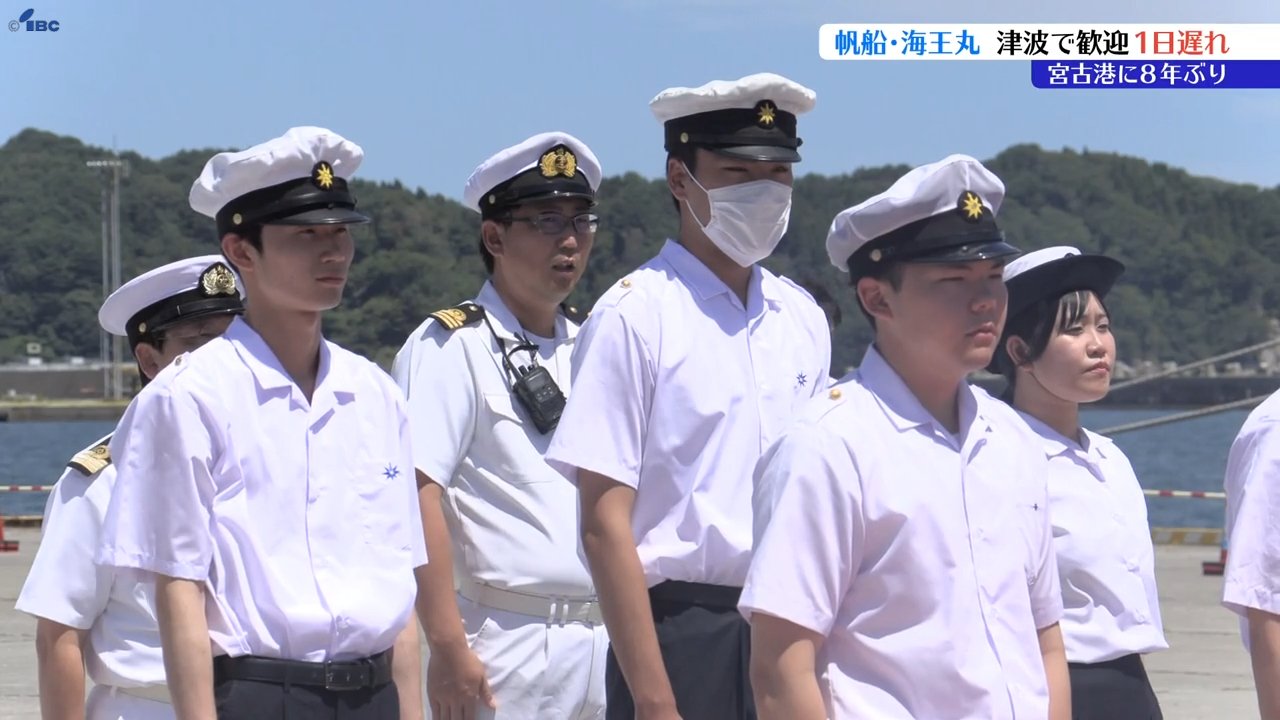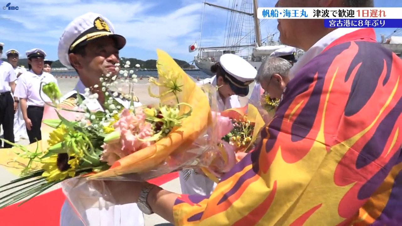 大型帆船「海王丸」の歓迎セレモニーが1日、岩手県宮古市の宮古港で行われました。津波の影響で1日遅れのセレモニーです。