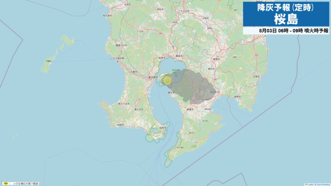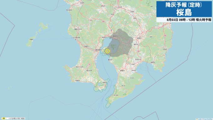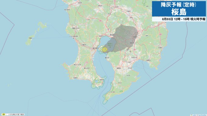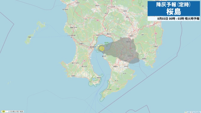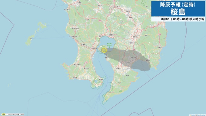 桜島で噴火が発生した場合には、2日21時から24時までは火口から東方向、3日09時から12時までは火口から北東方向に降灰が予想されます。