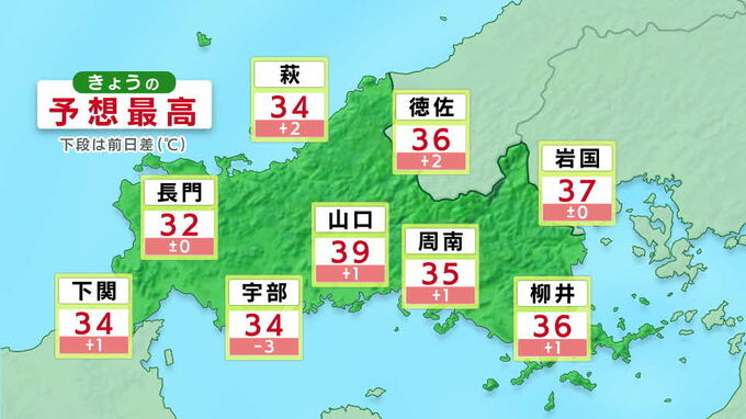 下関33度、山口39度、柳井35度、萩33度