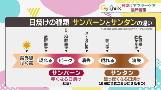 ●サンバーン…紫外線に当たると皮膚に炎症が起こり、数時間後から現れる真っ赤で痛い日焼け。