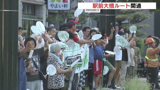一番電車には、朝早くから並んだ125人が乗り込み、高架を下って市中心部へと向かいました。被爆電車も真新しい線路を走り、沿線の人たちが電車に手を振っていました。