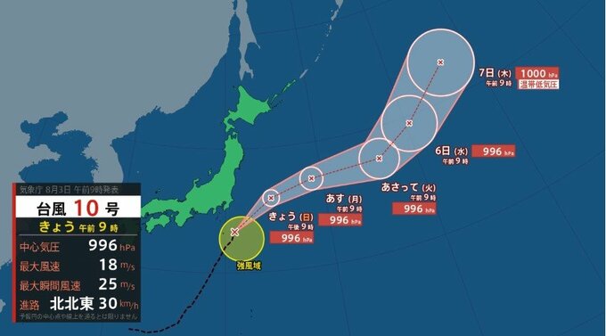 気象庁によりますと、3日午前9時、八丈島の東約100キロにおいて、熱帯低気圧が台風10号になりました。台風は1時間におよそ30キロの速さで北北東へ進んでいます。中心の気圧は996ヘクトパスカル、中心付近の最大風速は18メートル、最大瞬間風速は25メートルで中心の南東側280キロ以内と北西側110キロ以内では風速15メートル以上の強い風が吹いています。
