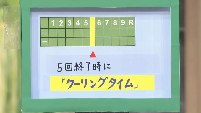 試合中の熱中症対策としては、5回終了時点に「クーリングタイム」を設けます。