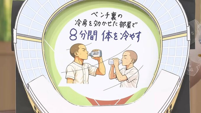 選手はベンチ裏などの冷房を効かせた部屋で8分間、体を冷やし、また、飲み物については各高校に任せるのではなく、主催者側がシャーベット状に凍らせたドリンクなどを準備します。