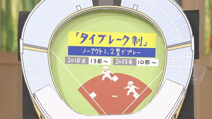 延長戦の決着を早めるため、ノーアウト1・2塁の状態でプレーを始める「タイブレーク制」は2018年に導入されましたが、当初は「13回から」適用されていたのが、2023年からは「10回から」に前倒しされました。