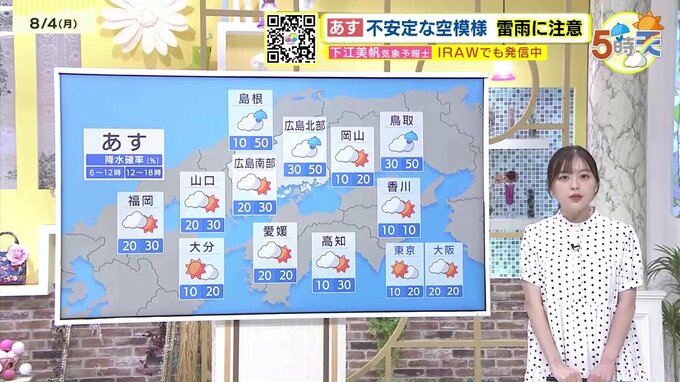 きょう8月4日(月)の広島県内は、土日の強烈な日差し・記録的暑さから一転、朝から雲が広がりやすく雨が降った地点もあります。きょう県内で猛暑日となったのは2地点のみで、4地点で日中の気温が30℃を下回…