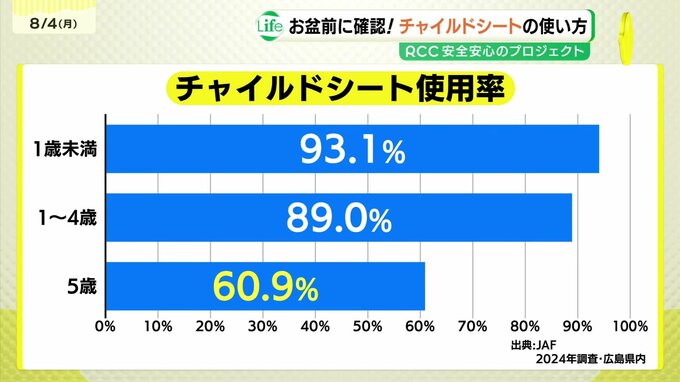 家族そろって車で出かける機会が増えるお盆のシーズン。子どもの安全を守るのに欠かせないのが、「チャイルドシート」です。6歳未満の着用が義務づけられているチャイルドシートですが、JAFが広島県内で行った調査によりますと、着用率は年齢が上がるにつれて下がる傾向にあり、5歳児では約60%に留まっています。