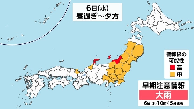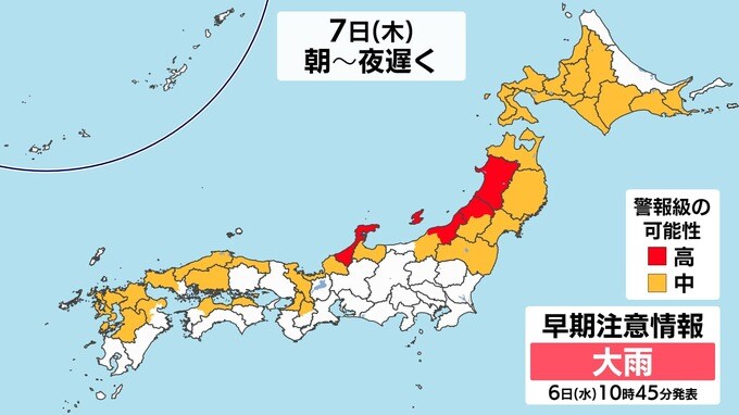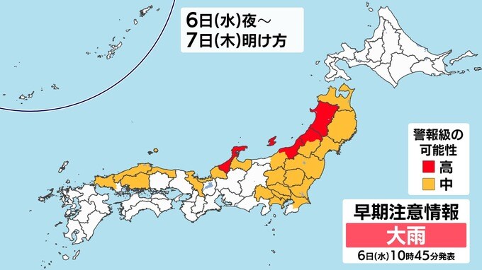 雨雲が予想以上に発達した場合や、発達した雨雲がかかり続けた場合には、警報級の大雨となる可能性があります。石川県・新潟県・山形県・秋田県は警報級の可能性【高】となっています。水不足を解消する程度の雨ならいいのですが、警報のおそれがるため、土砂災害、低い土地への浸水、河川の増水に注意・警戒してください。画像で確認できます。