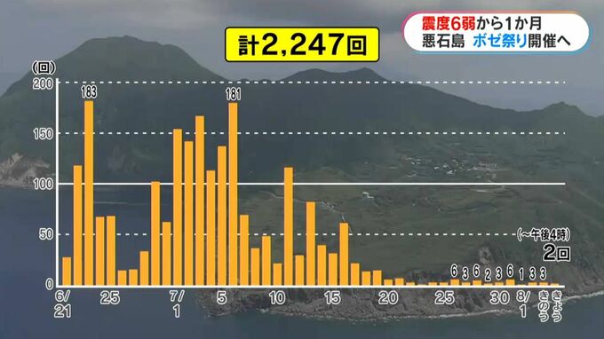 トカラ列島近海では6月21日以降、地震が相次ぎ、この1か月半、十島村では震度1以上を2200回以上観測。先月3日に、一連の地震で最大の震度6弱を悪石島で観測しました。その後、地震は徐々に減り、先月20日以降は1桁で収まっています。