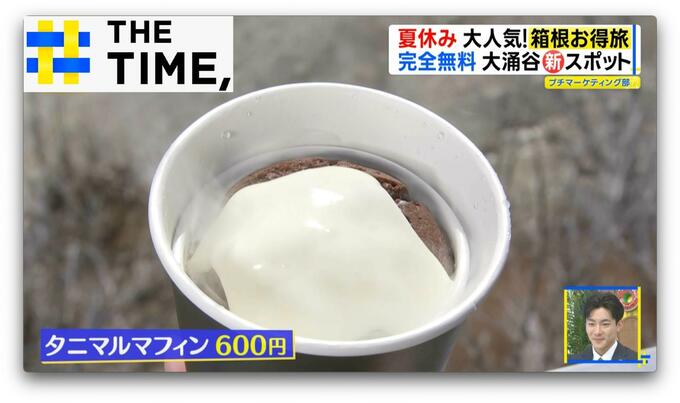 チョコレートマフィンを山に見立て、上にのせたクリームチーズのソースで噴気を演出。さらに、マフィンよりひと回り大きいカップの底にドライアイスを入れ、その上にマフィンを置くことでカップの隙間からドライアイスの煙が。大涌谷の噴気が再現されています。
