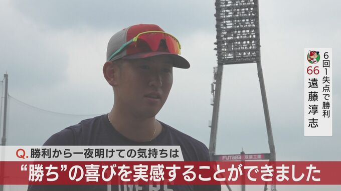 8月3日の中日戦で2年4ヶ月ぶりの勝利を挙げたカープの遠藤淳志。RCCのテレビ・ラジオで中継していましたが、球場内の音響トラブルでヒーローインタビューが中止となるハプニングで声をお届けできませんでした。なんとか本人の声をファンのみなさんへ届けたいと思い、翌日の練習後に“1日遅れ”のヒーローインタビューを実施しました。<RCCテレビ・8月4日(月)カーチカチTV放送・未公開部分も含む>