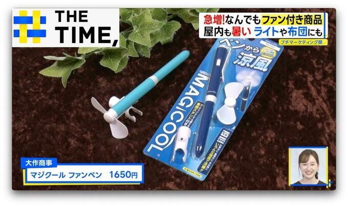 ペンのお尻の部分に小型ファンがついた「マジクール ファンペン」(大作商事/1650円)は、小さいながらも強力風力。コンパクトサイズなので持ち運びもでき、専用スタンドを付ければ卓上型にもなります。