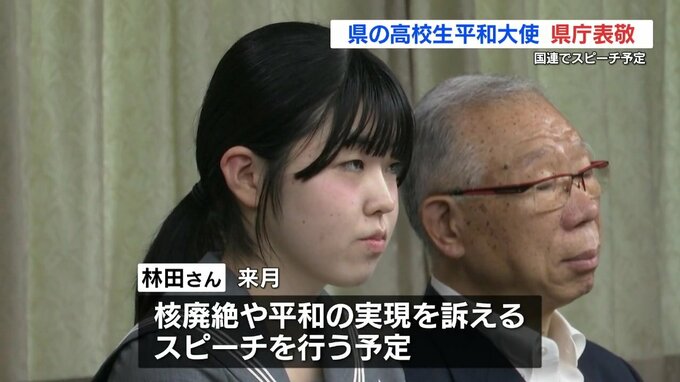 国連の欧州本部などでスピーチする熊本県の「高校生平和大使」が県庁を訪れ、平和への思いを語りました。高校生平和大使に選ばれたのは、済々黌の林田美咲さん(16)です。広島で平和研修などを重ねてきた林田さん…