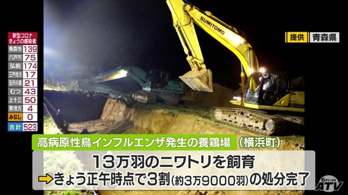 青森県横浜町の養鶏場で見つかった鳥インフルエンザの疑いがある事例について、青森県は遺伝子検査で陽性を確認し、飼育しているニワトリ13万羽の処分に入りました。