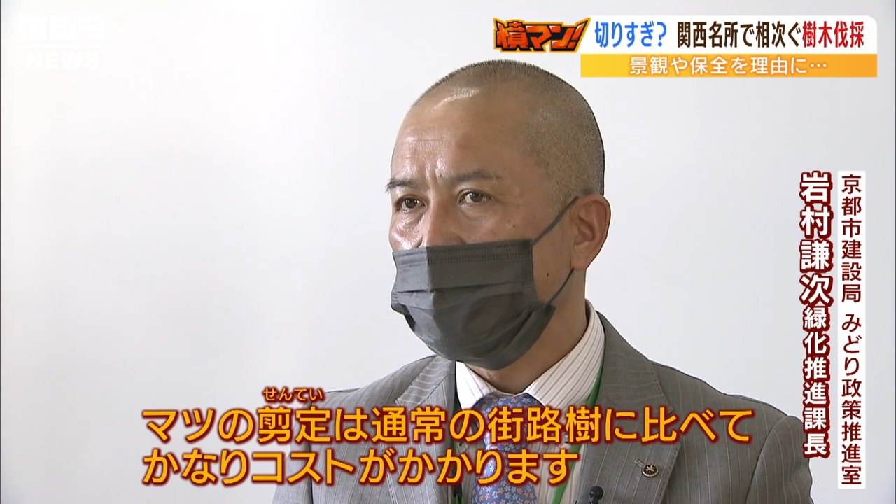「マツの剪定は通常の街路樹に比べてかなりコストがかかります。そういうこともありますので、なかなか定期的な管理が行き届いてないというところもありますね。(Qコスト面も理由としてある?)そういうことですね。なかなかコストがかかるということで、定期的な剪定ができておりません」