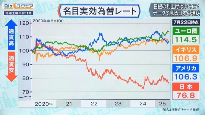 複数の国の通貨に対する自国通貨の総合的な価値を示す【名目実効為替レート】を見ると、日本だけ価値が下がっている。