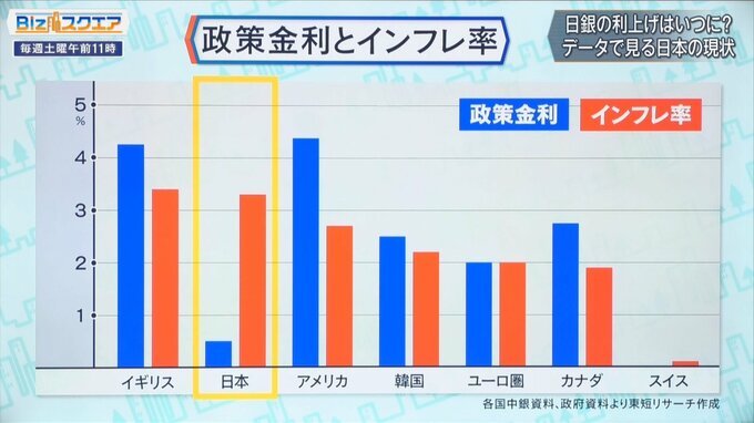 「日本のインフレ率は、先進国ではトップクラス。ガソリンなどの補助金を政府が出してるから3.3%で済んでいるが、それがなければもっと上がる。一方で、政策金利は突出して低い。そうすると政策金利からインフレを差し引いた<実質金利>で考えると、日本は圧倒的に低い。これが基本的に円安を招いている」