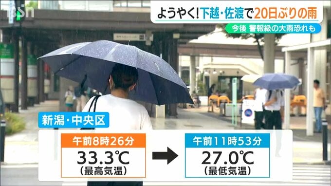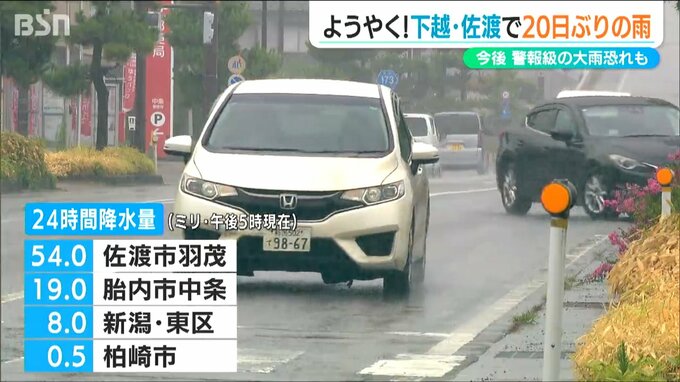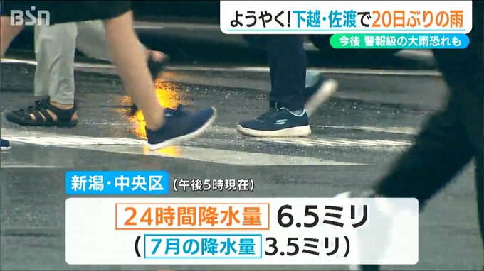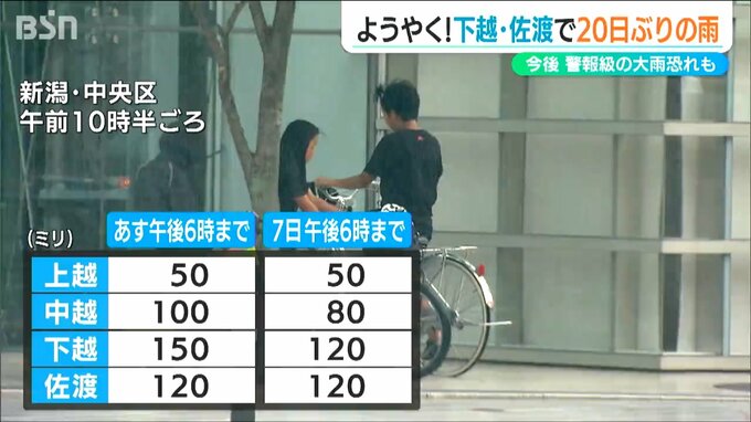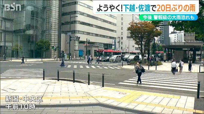 新潟県内では5日、下越・佐渡を中心に20日ぶりの雨を観測しました。新潟市で降水量が5ミリを超えたのは、実に42日ぶり。恵みの雨となるといいのですが、今後、警報級の大雨となる恐れがあります。