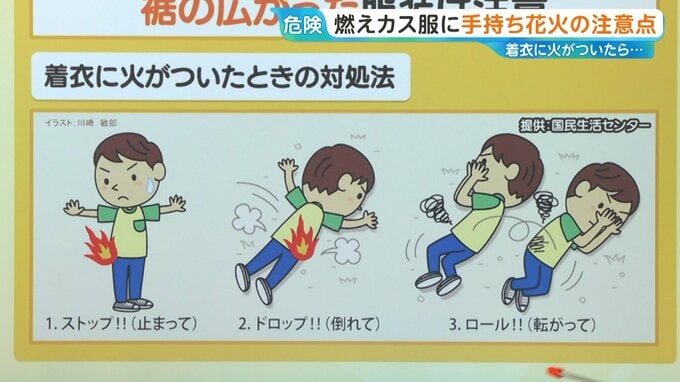 万が一、着衣に火がついた時の対処法です。事前に子どもに教えておくことも大切です。