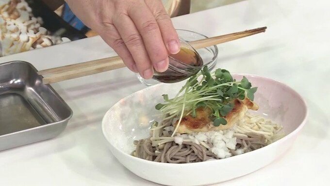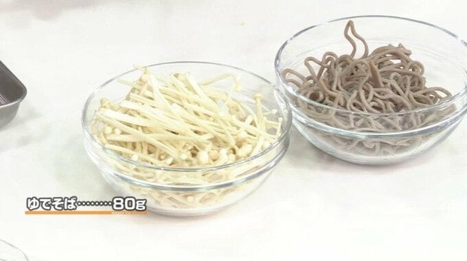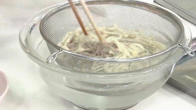 3.ゆでそばとえのきだけを一緒にゆでる。ゆで上がったらザルにあけ水で軽く洗う。