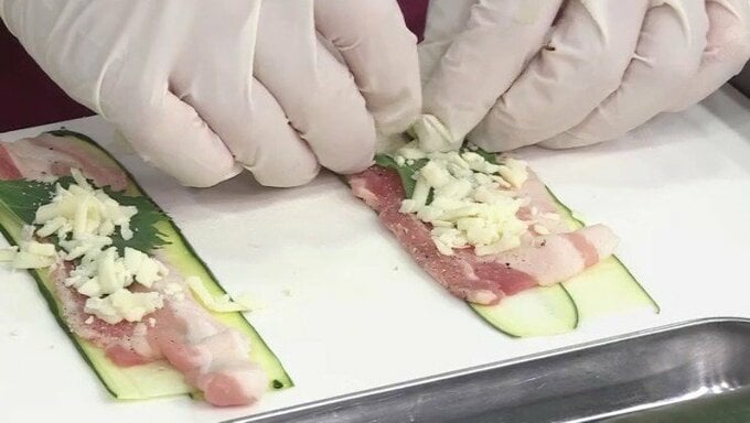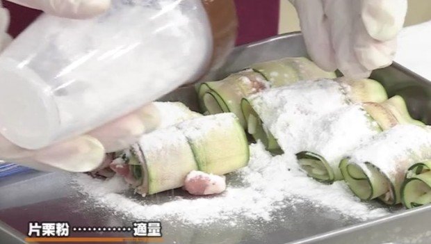 3.スライスしたズッキーニに、豚バラ・大葉・チーズの順にのせて巻き、全体に片栗粉をまぶす。(6~8個)