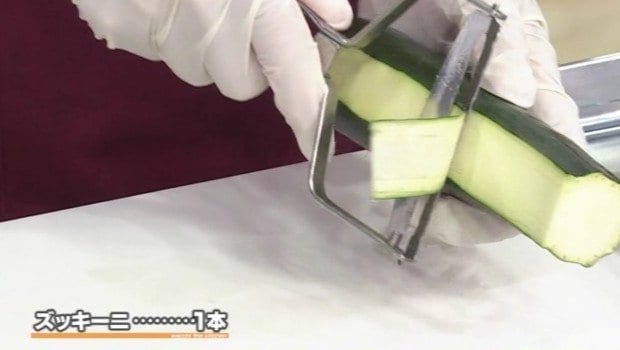1.ズッキーニはヘタを取り、ピーラーでスライスする。