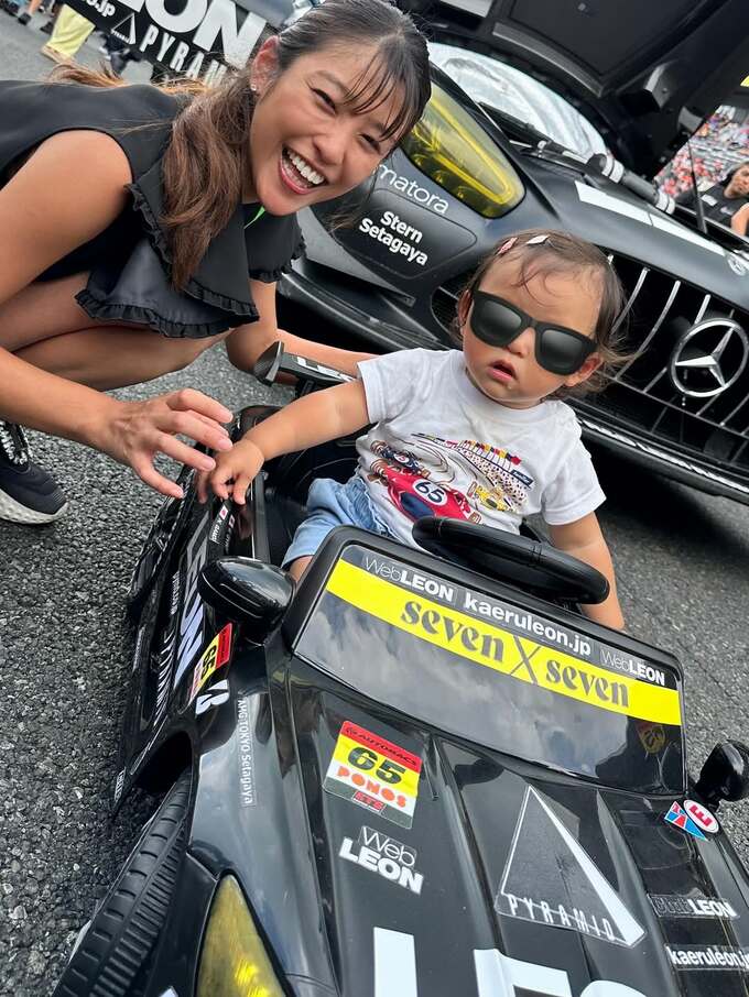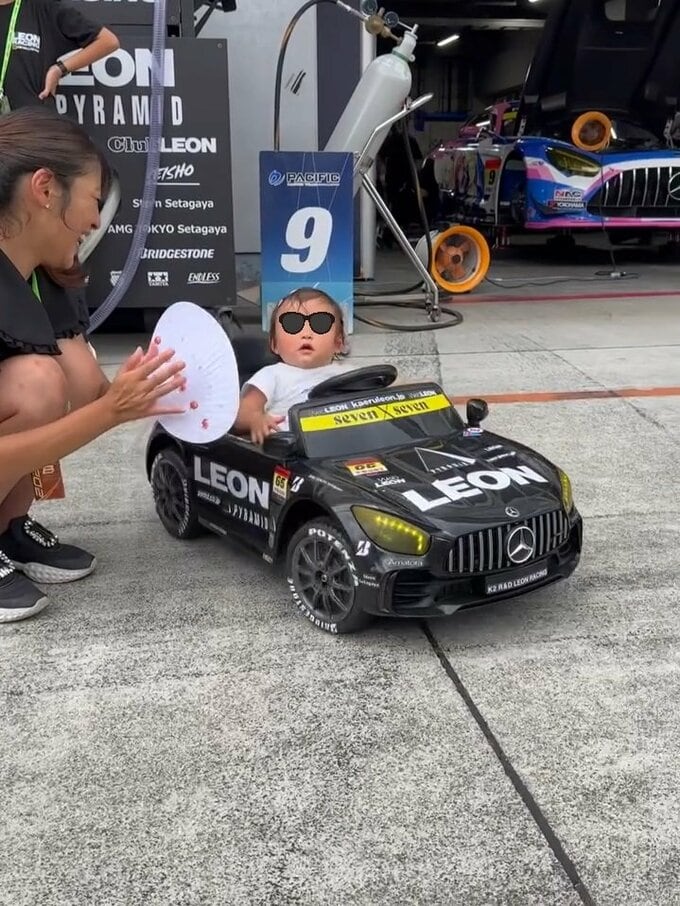 岡副さんは「月1ペースでサーキットに行っている1歳児」とテキストして、娘が1歳ながらメルセデス・ベンツのエンブレムを掲げた黒のGTカーに乗っている写真を投稿。それはピットの中にあるレース用GTカー「LEON PYRAMID AMG」そっくりに作られたトイカーのようです。