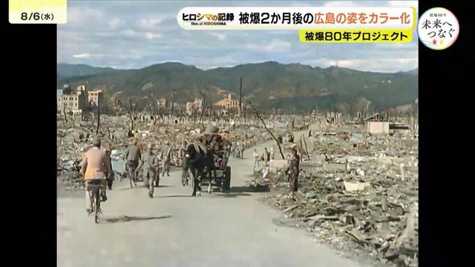 そして、色を添えた映像。焼け野原にあるバラックのそばを人が歩いていることが確認できます。カラーになることで、これまで目に止まらなかったところが見えるようになります。行き交う人の息づかいや、傷ついた人たちの体温も感じることができます。