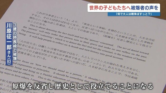 川原征一郎さん(83)「〜世界の国々の子供達へ〜これをニューヨークで話したいですね」
